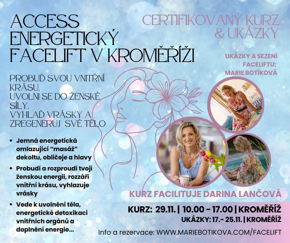 Access energetický facelift si můžeš vyzkoušet u mě v terapuetovně v Kroměříži (ve Zracené ulici) - jsem už šestým rokem praktikem této metody. Můžeš si užít hodinovou péči nebo můžeš přijít na pravidelné výměny Access praktiků (podívej se do sekce Akce - tam mám vždy jedno místo pro ukázky a přihlas se s uvedením poznámky, že si chceš vyzkoušet Facelift).
